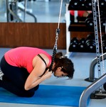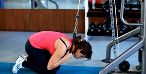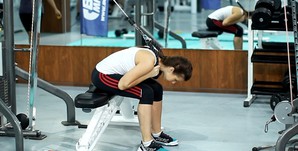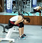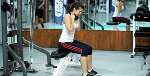 - Отрегулируйте вес и сядьте на скамью тренажера. Ступни поставьте под валики, руками ухватитесь за верхние ручки так, чтобы локоть был согнут под прямым углом, трицепсами упритесь в подлокотники. Это исходная позиция.