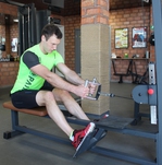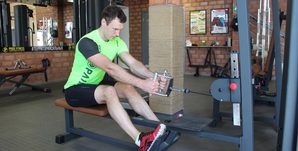 - Возьмите гриф, прикрепленный к верхнему блоку, широким хватом, ладонями вперед. Сядьте на тренажер, расположите бедра плотно под валиками, стопы прижмите к полу.
