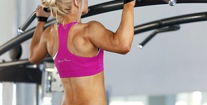 - На выдохе опустите гриф вниз за голову, пока он не коснется задней части шеи, максимально сводя лопатки вместе. Важно: Сконцентрируйтесь на работе мышц спины. Если во время выполнения этого упражнения вы чувствуете преимущественно работу рук, это будет сигналом о неправильном выполнении.