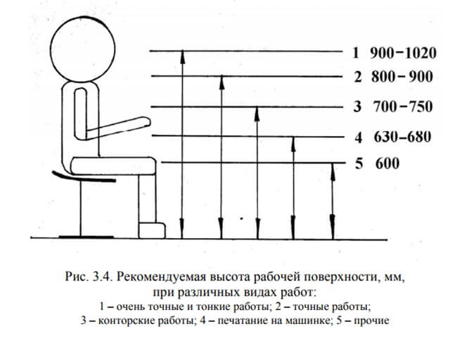 - Нельзя допустить, чтобы рабочая поверхность находилась слишком низко или высоко. Также важно учитывать ее высоту по отношению к форме и размеру стула. Оптимальная высота рабочей поверхности, в которой совершаются трудовые движения (картинка из учебного пособия “Основные сведения о БЖД” В. С. Цепелев, Г. В. Тягунов, И. Н. Фетисов):
