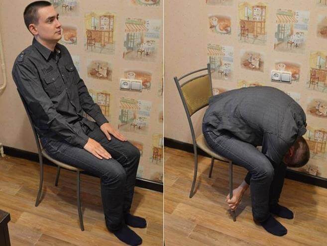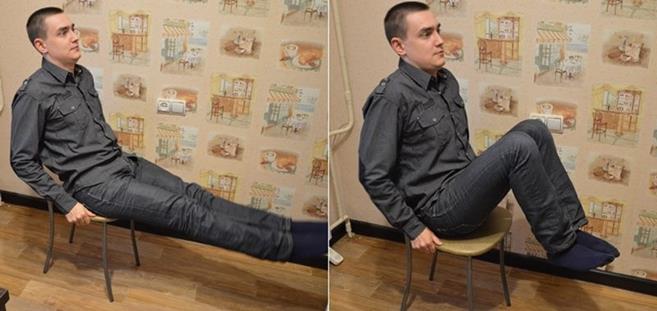 - Приседания у стула 10 раз. Можно выполнять лицом к стулу, держась обеими руками