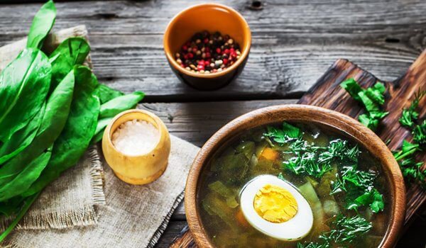 - Мелко нарезать щавель, добавить в суп. Варить до темного цвета щавеля.