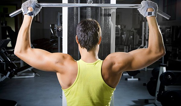 Для проработки широчайшей мышцы хорошо использовать подтягивания широким хватом. Что касается работы с тренажерами, выбирайте тягу верхнего блока к груди и за голову. Желательно работать широким хватом. Подробнее о тренировке крыльев читайте в нашей статье Как накачать крылья спины
