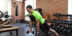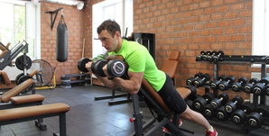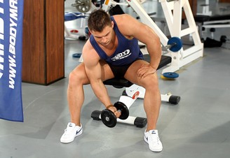 - В одну руку возьмите гантель и сядьте на прямую скамью. Ноги расставьте порознь, между ними опустите снаряд. Ваши колени должны быть согнуты, а ступни – полностью стоять на полу.