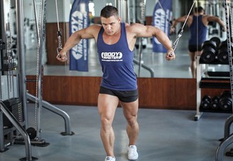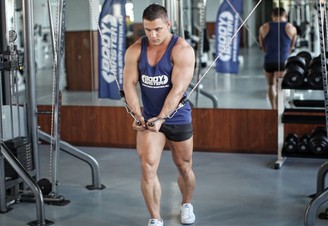 Встаньте между стойками и обеими руками возьмитесь за тросы, сведите их перед собой. Немного наклонитесь вперед, слегка согните локти. Одновременно разведите обе руки: ладони должны оказаться на уровне плеч. Вернитесь в исходную позицию и повторите.