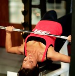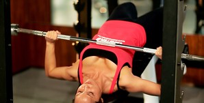 Накиньте цепи на концы штанги. Лягте на скамью так, чтобы штанга на стойках располагалась над головой. Прогните спину, плечи оторвите от скамьи. Снимите штангу со стоек и опустите на вдохе ее до нижних ребер, сделайте паузу и на выдохе рывком выжмите ее вверх.