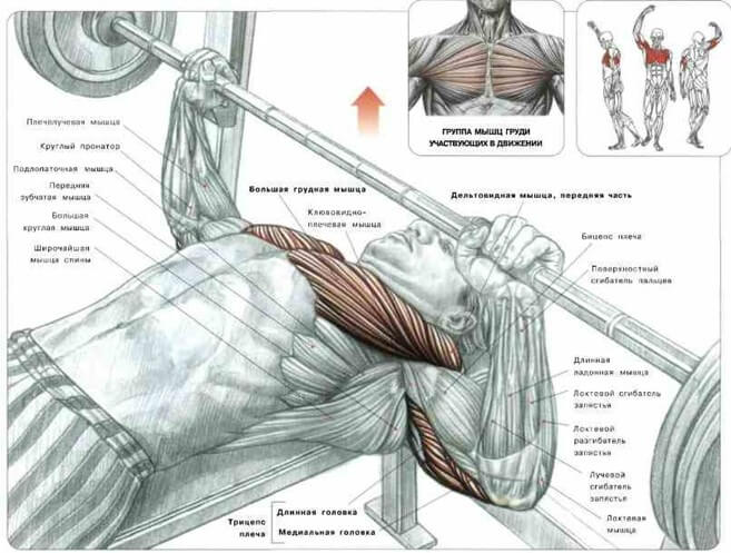 Во время выполнения жима штанги лежа на горизонтальной скамье, прорабатываются следующие группы мышц: