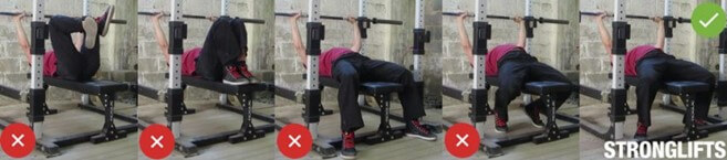 - Отрыв таза от скамьи. Правильная техника жима предусматривает наличие 3 точек опоры: лопаток, таза и пяток. Когда вы отрываете таз от скамьи - вы переносите нагрузку на ноги и лопатки, в то время как поясница получает сильную нагрузку. В таком положении не только тяжело держать равновесие, но можно и сорвать спину.