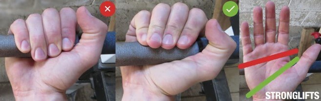 Гриф штанги необходимо держать как можно ближе к основанию ладони, чтобы придать запястьям устойчивое положение. Кроме того, вы должны попытаться “заблокировать” гриф пальцами. Для этого большой палец должен быть поставлен противоположно ко всем другим пальцам.