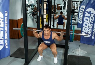 Установите штангу в соответствие с ростом и загрузите необходимым весом. Снимите гриф со стойки. На вдохе медленно опускайтесь. Бедро и голень должны образовать прямой угол.