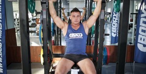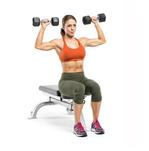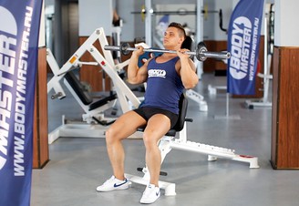 - Сядьте на скамью для жима сидя, возьмите штангу пронированным хватом (ладони смотрят вперед). Совет: Хват должен быть шире плеч, и когда штанга опускается вниз, предплечье и плечо составляют 90 градусов.