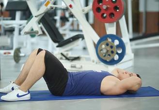 - Лягте на пол и оторвите ноги от пола, а затем немного их согните. Руки разместите за головой или на груди.