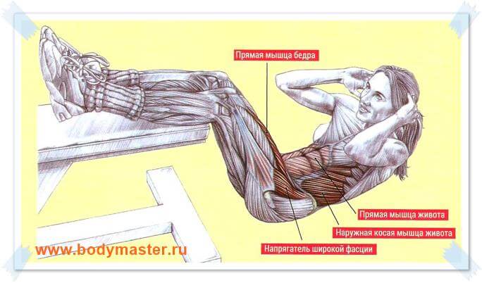 Таким же образом можно проработать и косые мышцы пресса, если выполнять боковые скручивания.