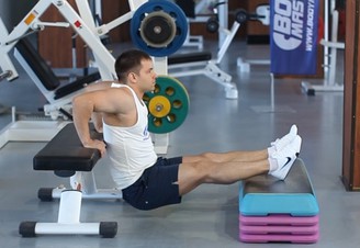 - Встаньте спиной к скамье. Упритесь в край скамьи прямыми руками на ширине плеч. Ноги вытянуты вперед, перпендикулярно туловищу. Это исходное положение.