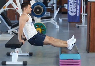 - Повторите необходимое количество раз. Варианты: чтобы усложнить, положите ноги на скамью перед собой. Если и такой вариант вам легко выполнять, положите на бёдра дополнительный вес.