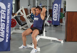 - Сядьте на скамью со спинкой. Поднимите гантель обеими руками и держите ее над головой на расстоянии вытянутой руки. Удерживайте гантель двумя руками за внутреннюю сторону диска ладонями вверх. Важно: лучше, если рядом будет человек, который подаст вам вес, особенно если вес большой. Это будет вашим исходным положением.