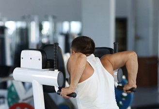 Держите тело на вытянутых руках. На вдохе медленно опуститесь, сохраняя корпус ровным в вертикальном положении. Согните руки до прямого угла, локти держите близко корпусу. На выдохе, концентрируясь на трицепсах, выпрямите руки обратно.