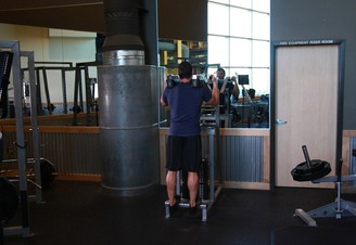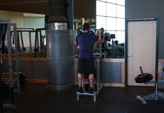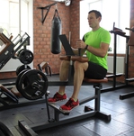 - Встаньте в тренажёр так, чтобы плечи упирались в валики, носки смотрели вперёд. Пятки свисают. Нагрузка приходится на пальцы. Держа спину прямой, поднимайтесь на носки, сокращая икроножные мышцы. Колени всегда немного согнуты. Носки могут смотреть прямо, либо направлены наружу или внутрь. Это исходное положение.