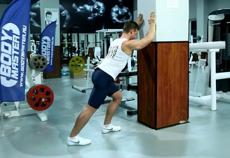 Растяжка икроножных мышц, упираясь ладонями в стену