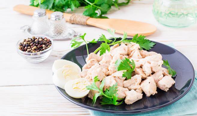 Для получения суточной нормы протеина нужно употребить порядка 300 грамм отварной куриной продукции, которые рекомендуется разделить на несколько приемов. Особенность белого мяса – быстрое и хорошее усвоение и универсальность при поддержании диеты любого характера.