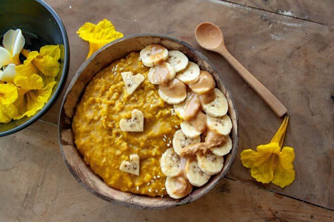 - Варить на среднем огне 20-25 минут. При подаче украсить нарезанным бананом и арахисовой пастой.