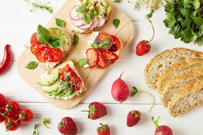 - На другую порцию тостов выложить пополам помидоры и авокадо, посыпать солью, украсить зеленью.