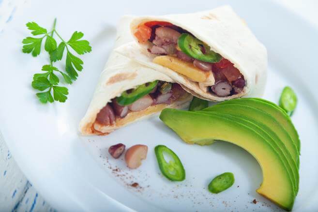 - Сборка: размазать пюре из черной фасоли по лепешке, положить сверху омлет. Добавить гарнир из соуса сальса, йогурта, авокадо и перца.