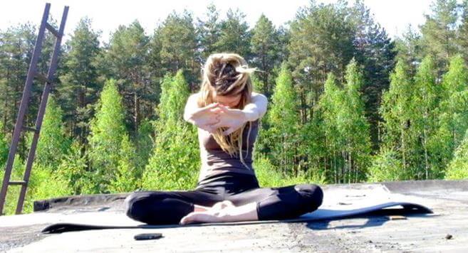 - Сидя со скрещенными ногами, сцепите руки в замок и потяните его вперед, округляя спину.