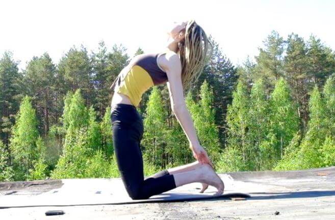 - Поднимите таз вверх и вперед. Прогибайтесь в грудном отделе и смотрите вверх.