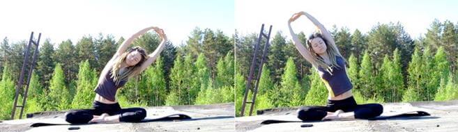 - Не меняя положение рук, наклонитесь вправо, со вдохом вернитесь в центр и повторите на левую сторону.