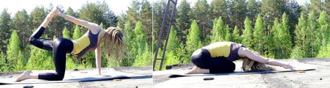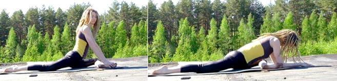 - Левая нога вытянута назад, носок натянут. Передвиньте руки вперед и сгибайте корпус, пока не почувствуете напряжение в правой ягодице.