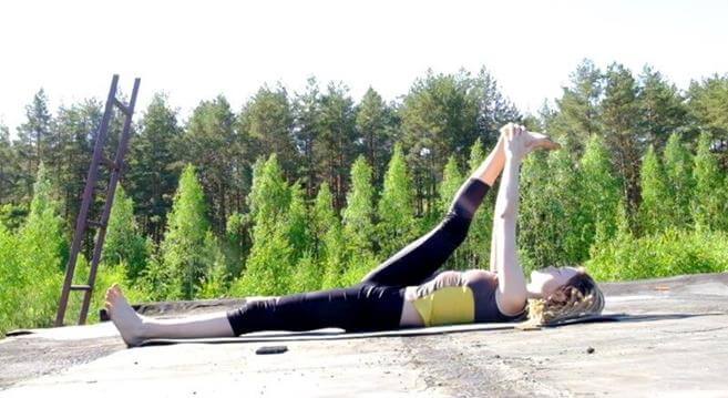 - Захватите себя за ступню или накиньте на стопу выпрямленной ноги ленту или ремень. Это исходное положение.
