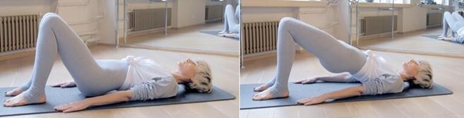 • Делаем вдох и с выдохом подкручиваем таз, активируя мышцы живота, задней поверхностью ног выталкиваемся вверх в плечевой мост. В верхнем положении копчиком тянемся в направлении коленей, сохраняя вытяжение позвоночника.