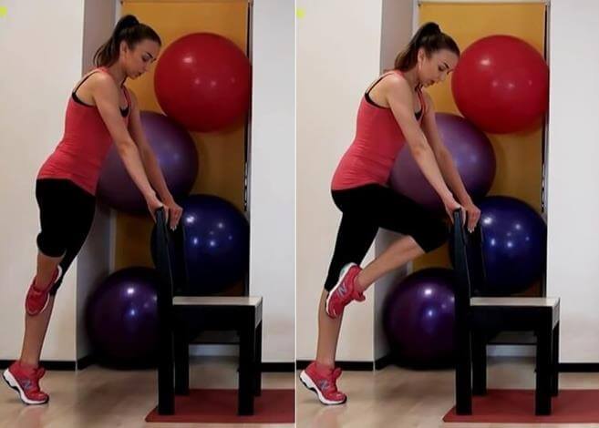 1. Стоя, держимся руками за стул, встаем на носочки, приподнимаем левую ногу к правому колену.