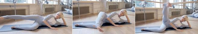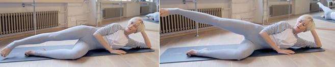 • Ложимся на бок, рука согнута в локте и заложена за голову, опорная нога согнута в колене, другая - прямая.